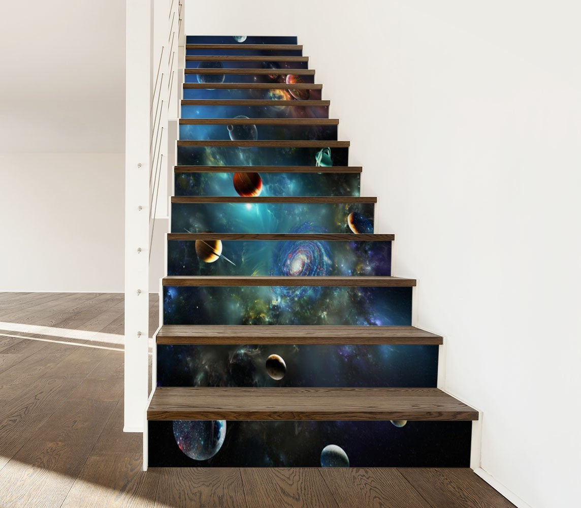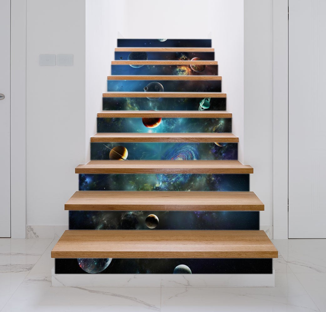 Universe Solar Nature Space Blue Stair Riser Decals, Waterproof Removable Staircase Decals, Vinyl Peel And Stick Stairs Decal Stickers