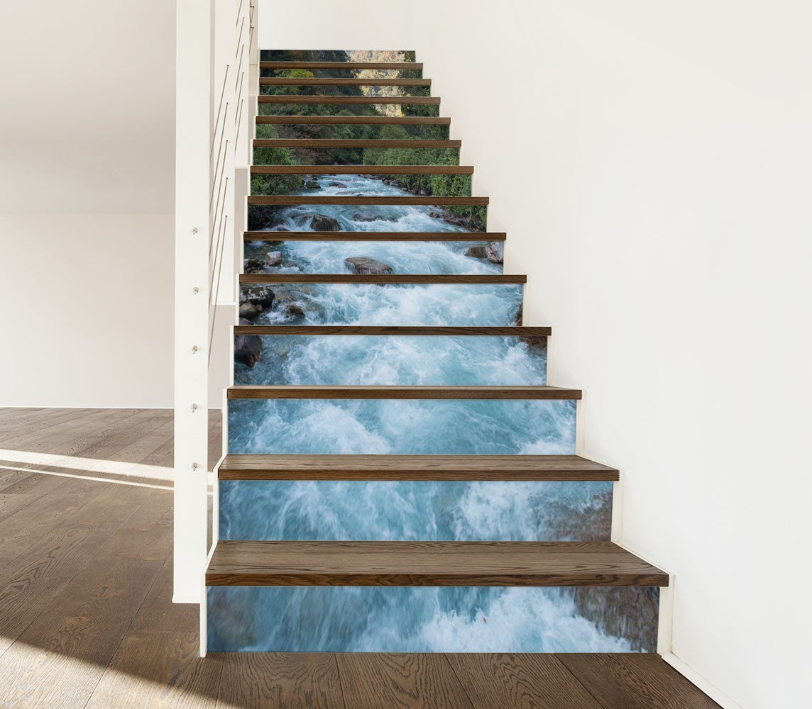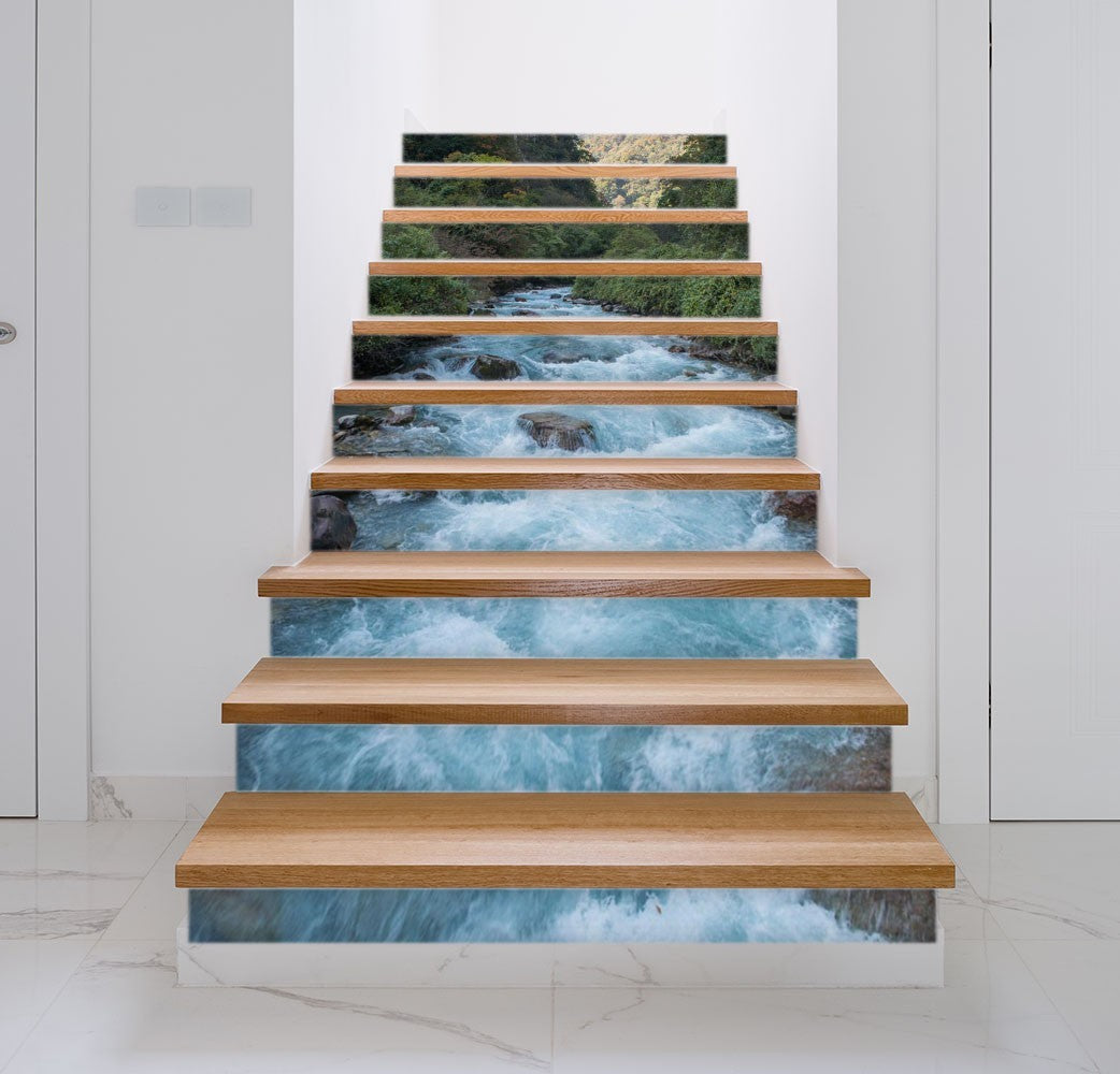 Valley River Nature Waterfall White Stair Riser Decals, Waterproof Removable Staircase Decals, Vinyl Peel And Stick Stairs Decal Stickers