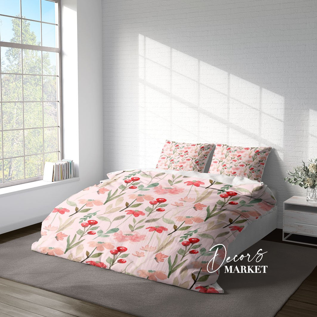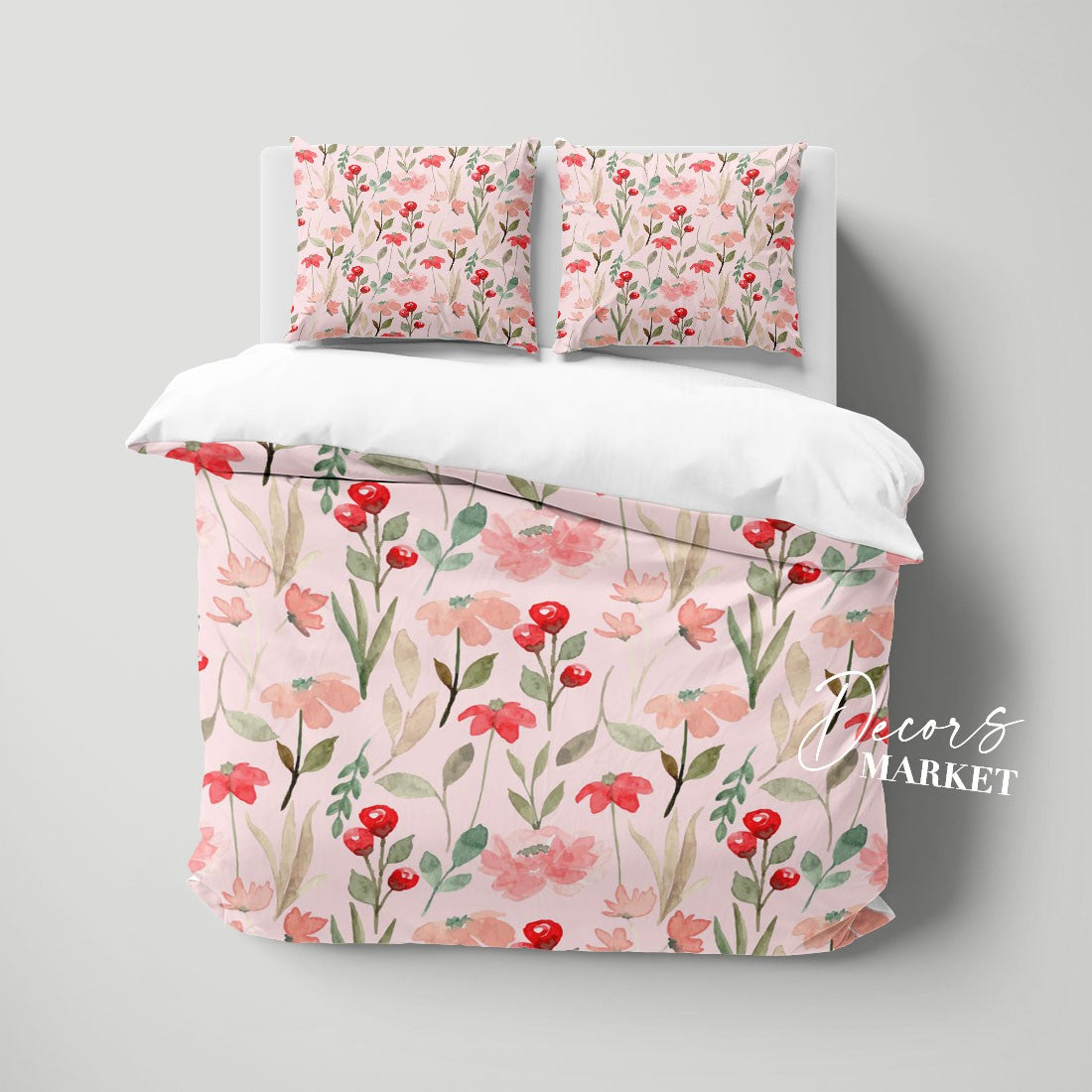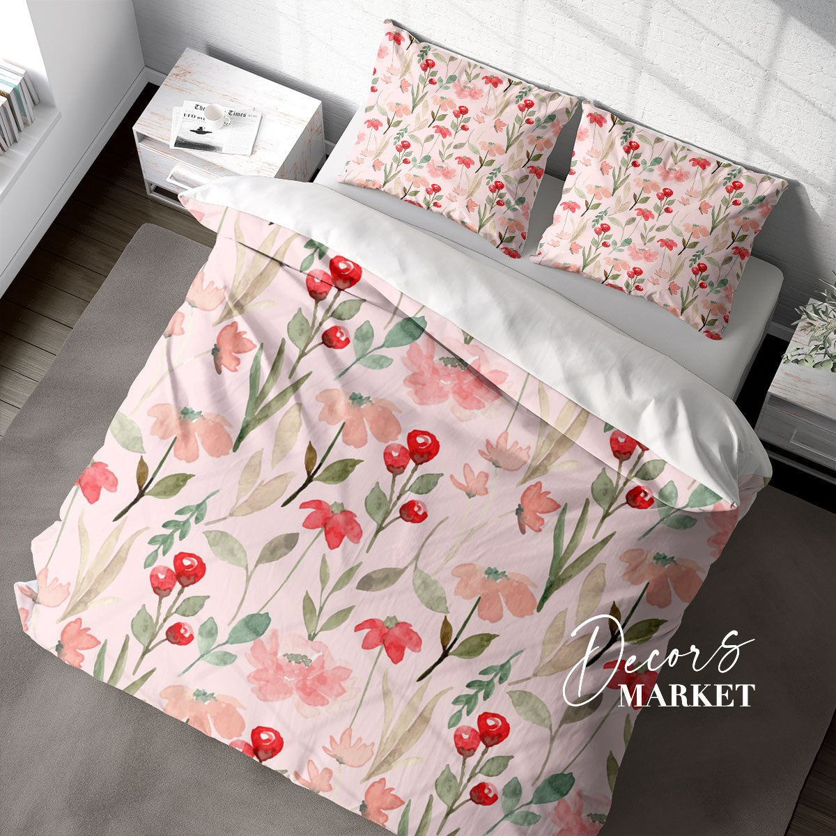 Watercolor Berry Branches Duvet Cover Set w Pillowcases, Red Floral Flowers 3D Quilt Cover, 3pc Single Double Queen King Size Doona Cover