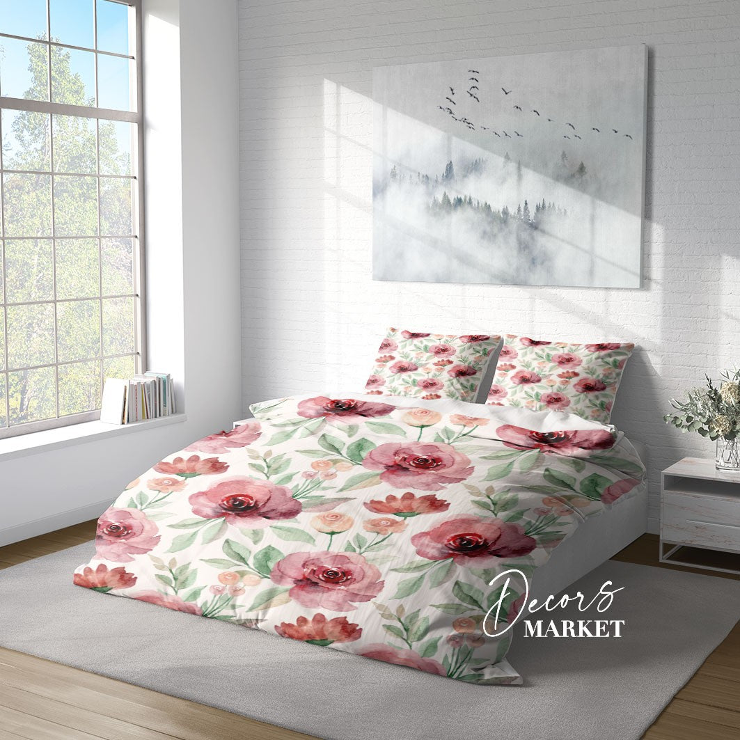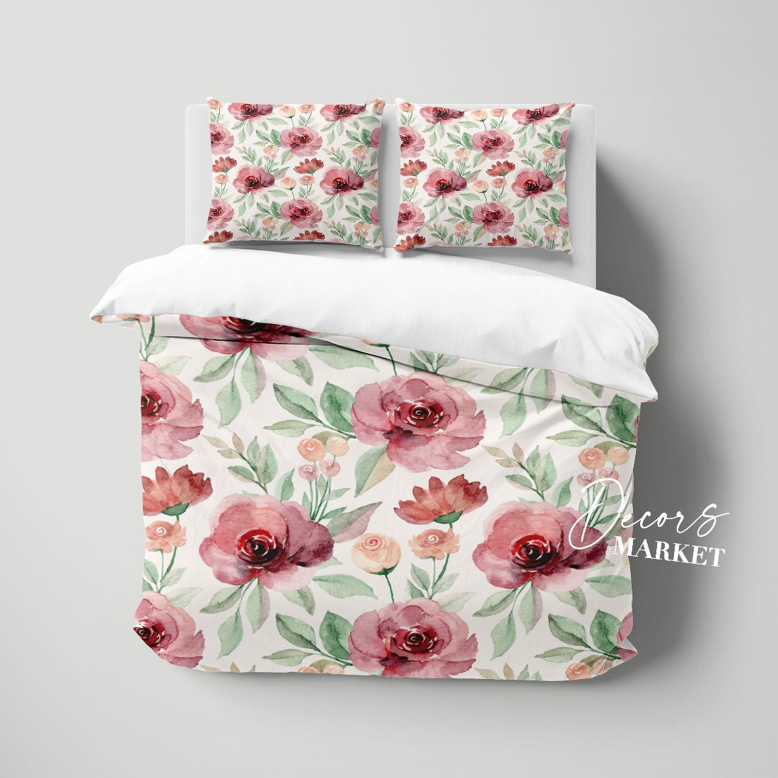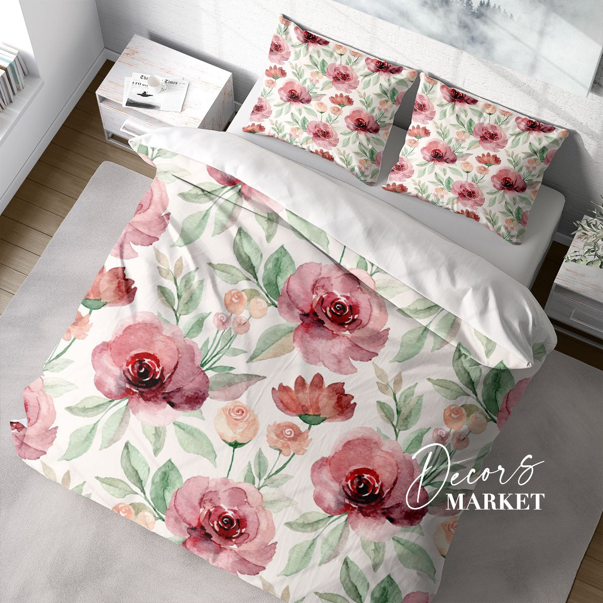 Watercolor Blossom Duvet Cover Set w Pillowcases, Red Floral Patterns 3D Quilt Cover, 3pc Single Double Queen King Size Doona Cover