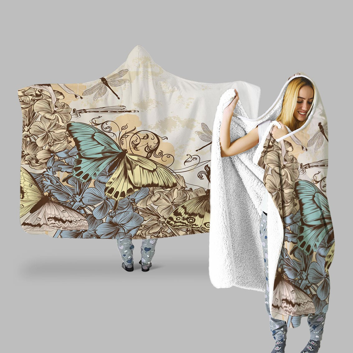 Watercolor Butterfly Dragonfly Floral Flowers Creamy Personalized Hooded Throw Blanket Fleece Hoodie Cape