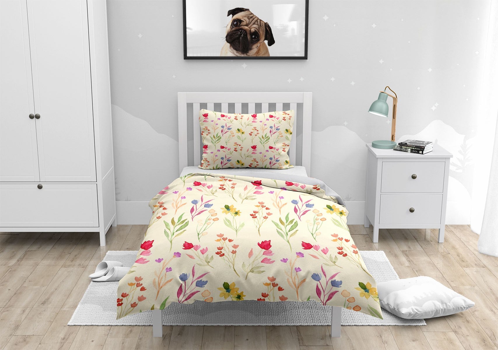 Watercolor Flowers Duvet Cover Set w Pillowcases, Yellow Kids Patterns 3D Quilt Cover, 3pc Single Double Queen King Size Doona Cover