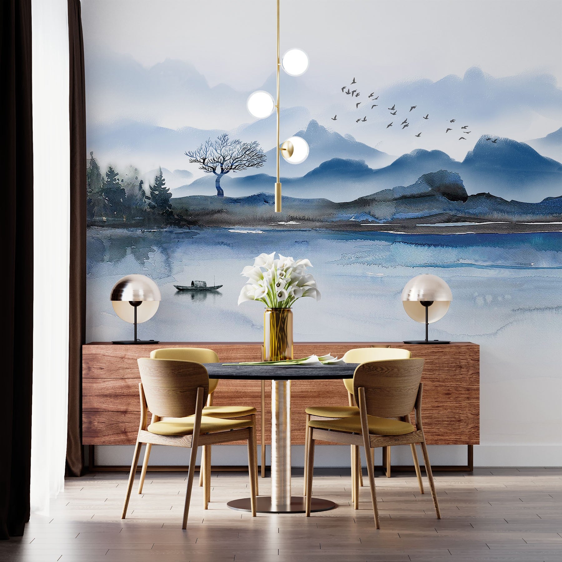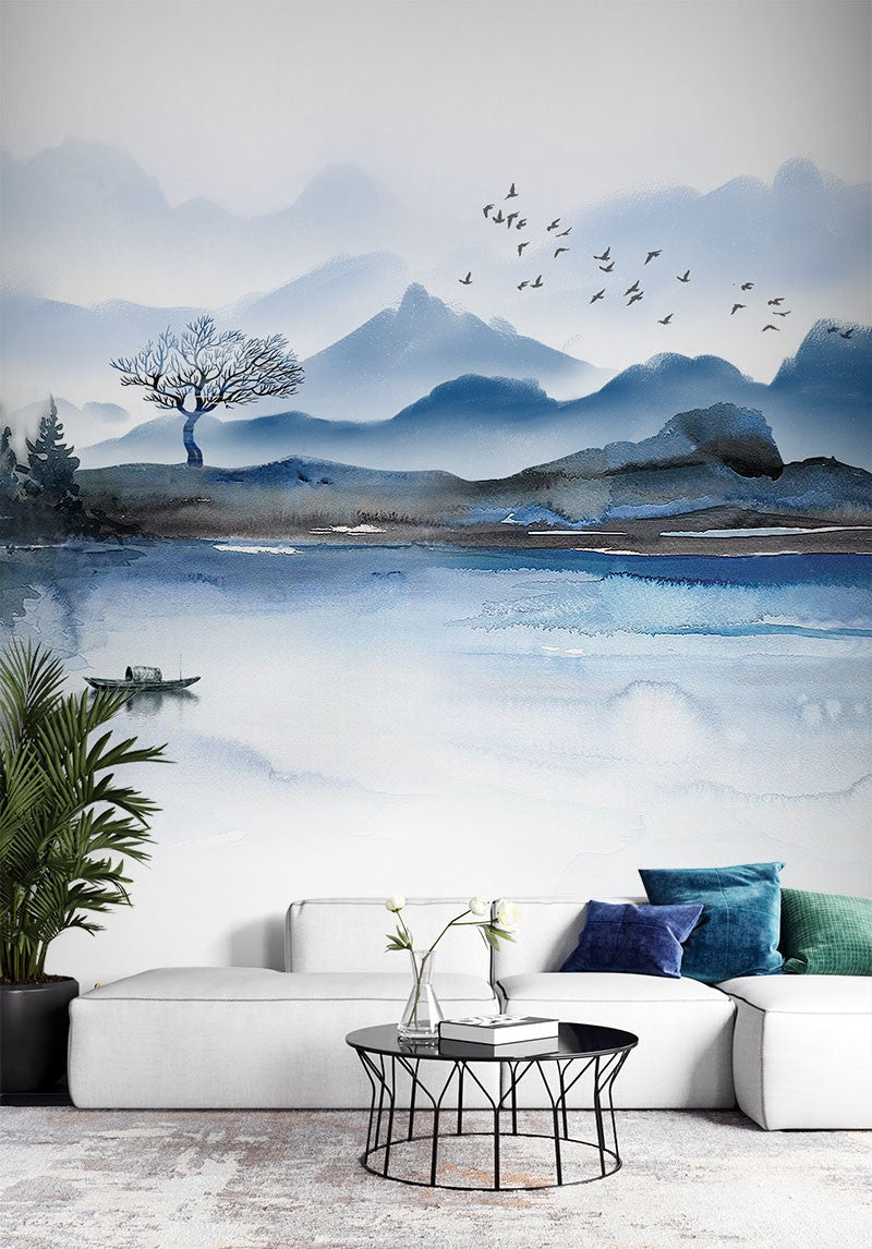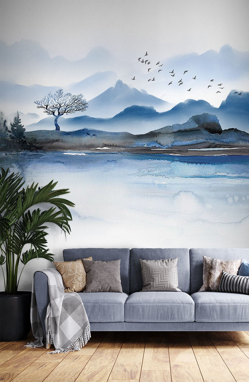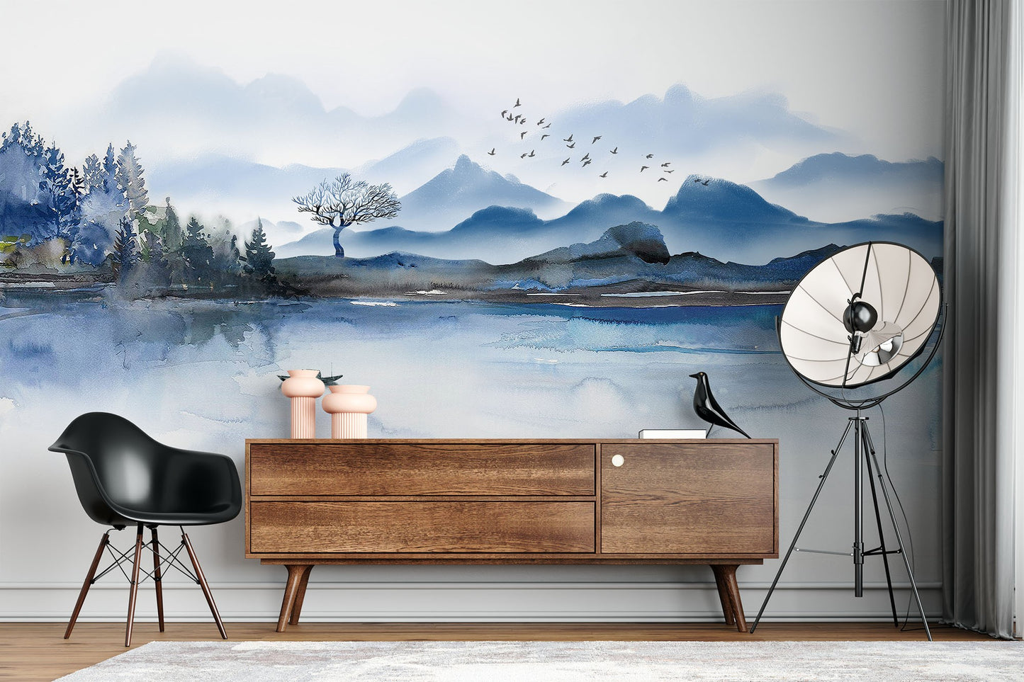 Watercolor Mountain Art Chinoiserie Blue Wallpaper Mural