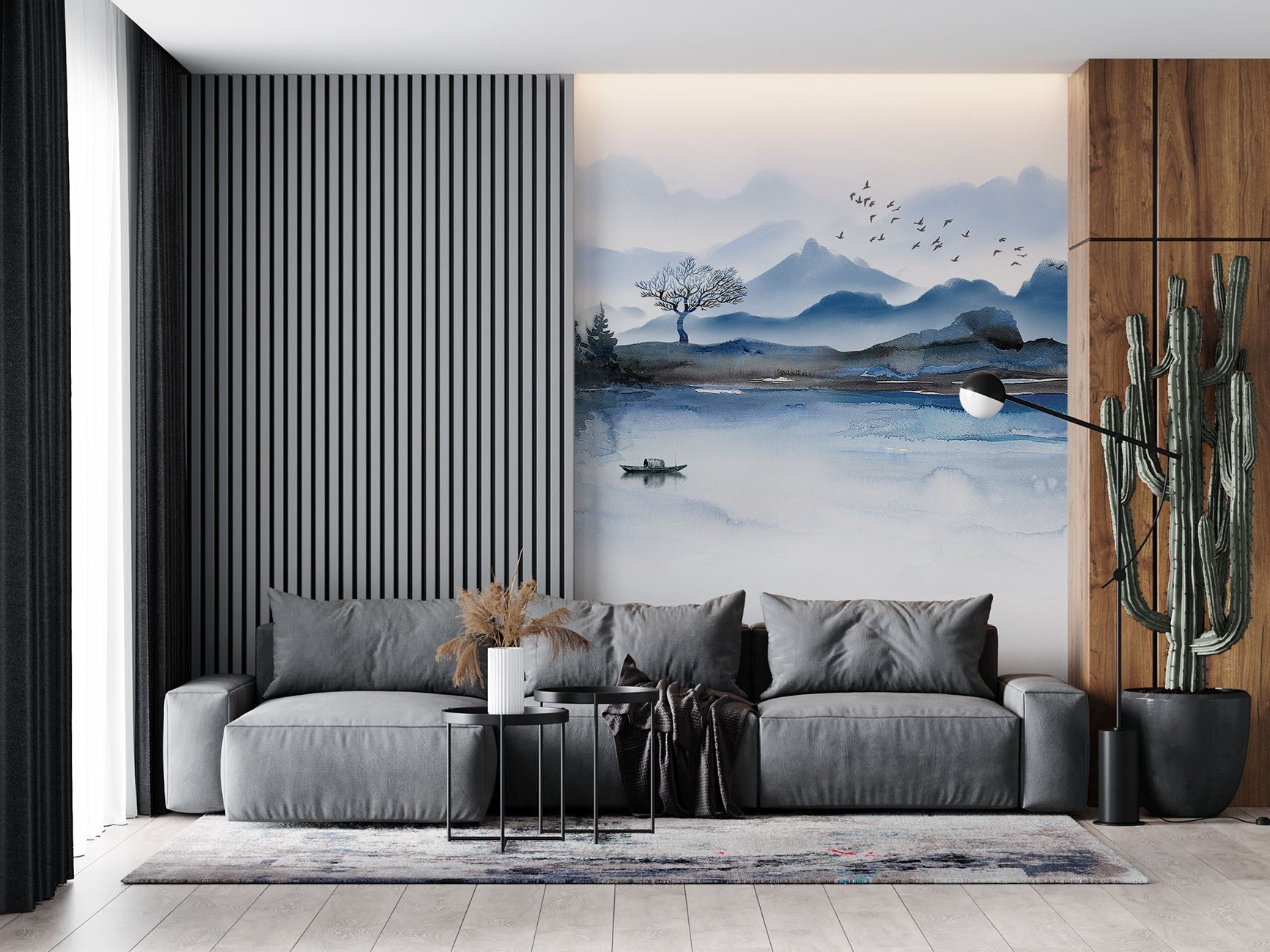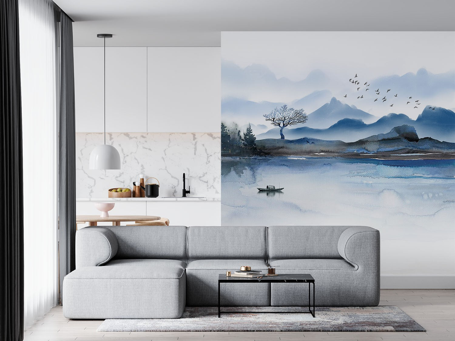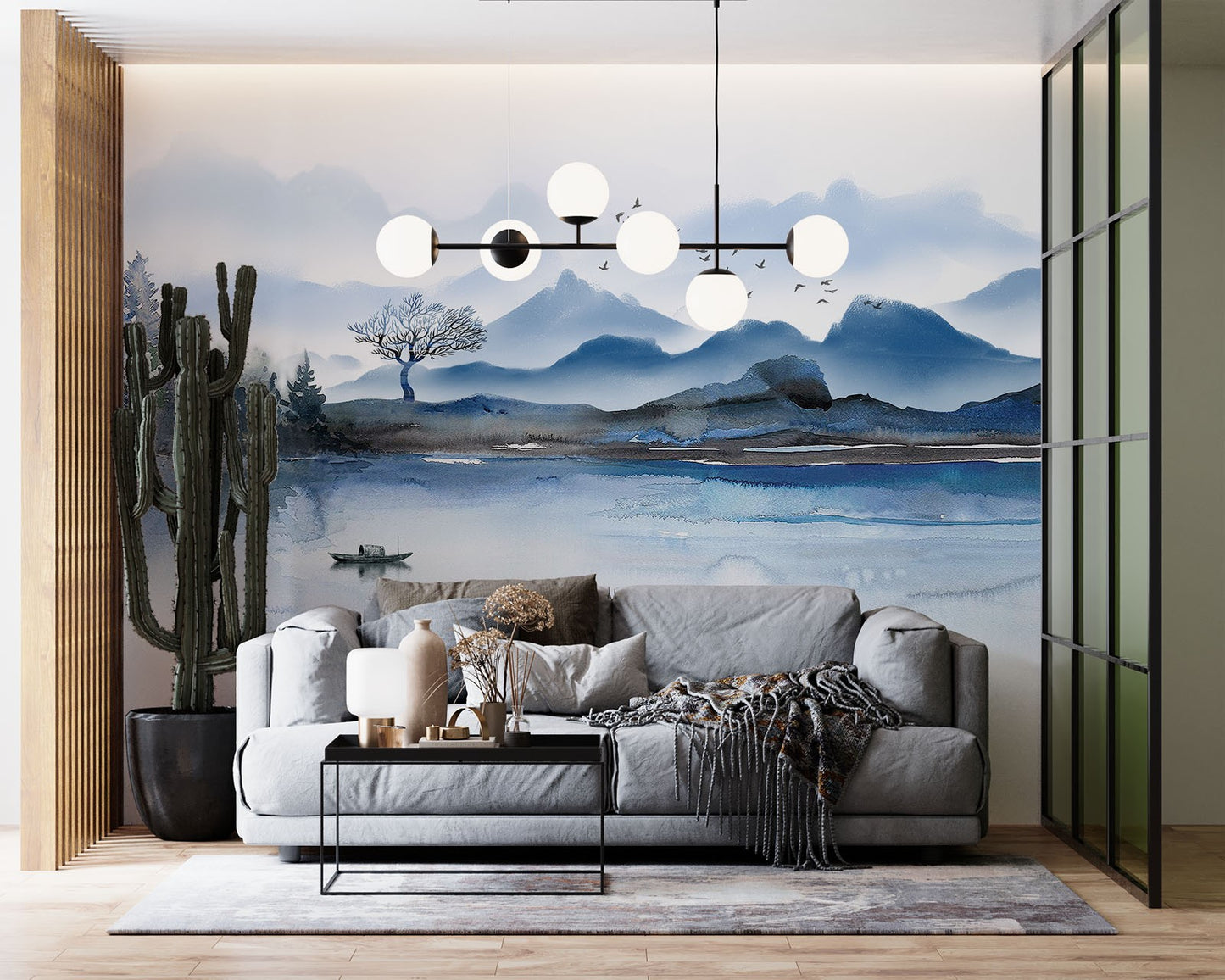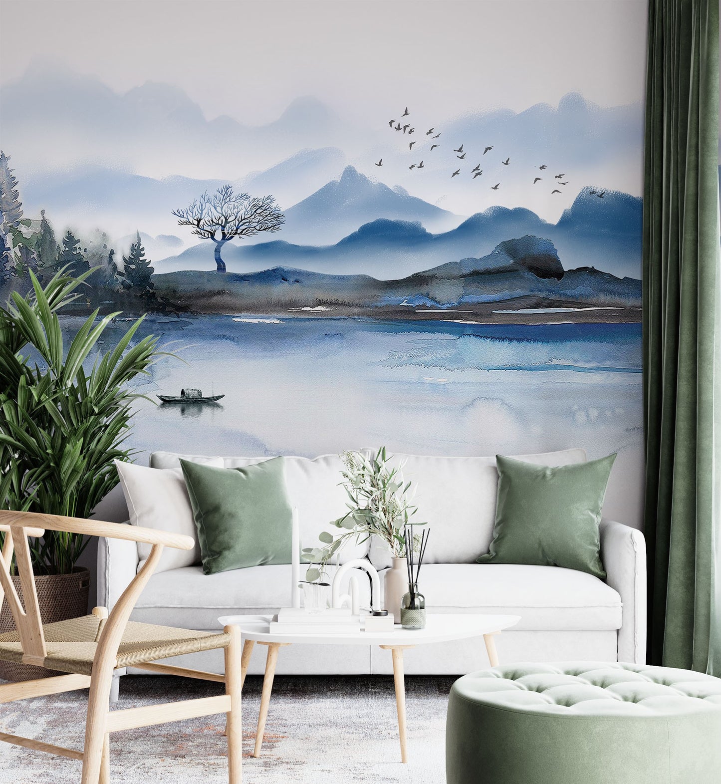 Watercolor Mountain Art Chinoiserie Blue Wallpaper Mural
