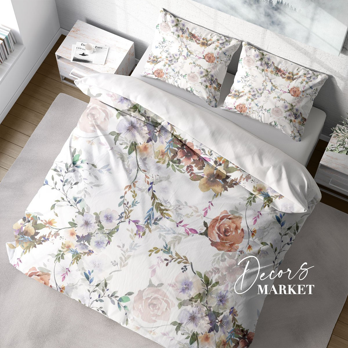 Watercolor Rose Vine Duvet Cover Set w Pillowcases, White Floral Patterns 3D Quilt Cover, 3pc Single Double Queen King Size Doona Cover