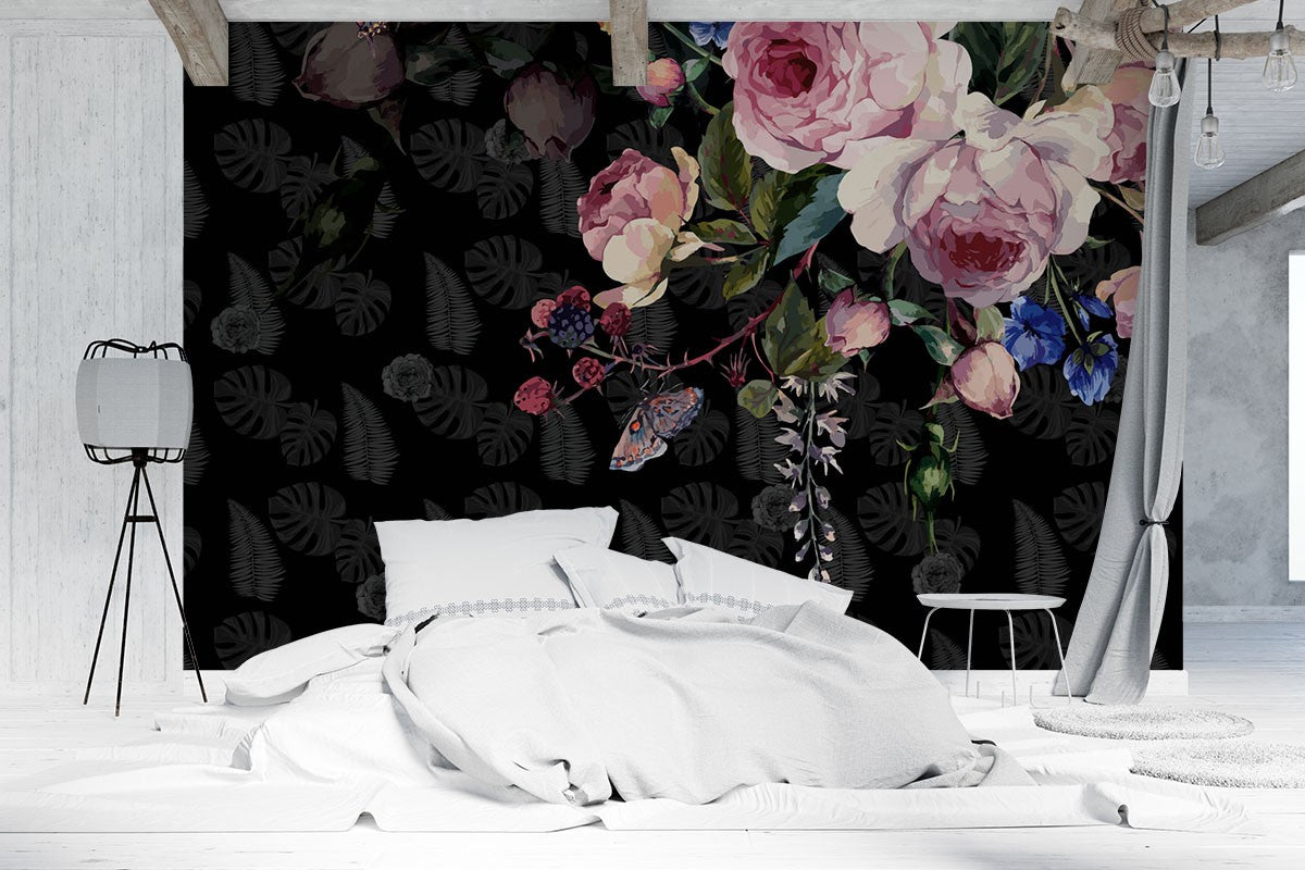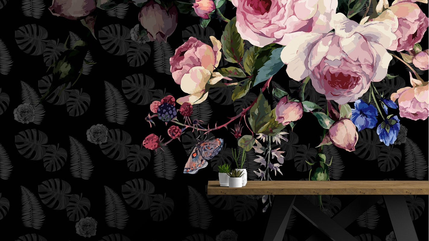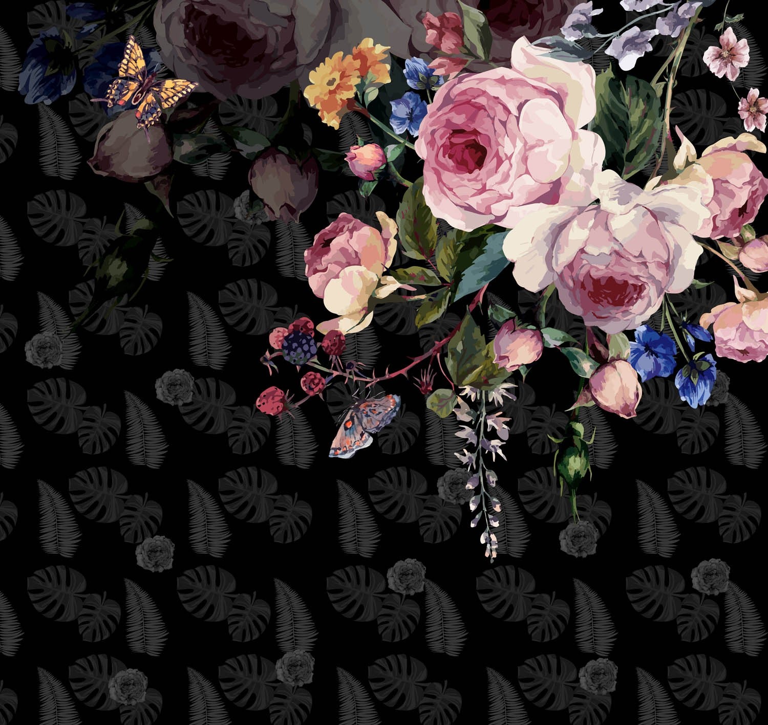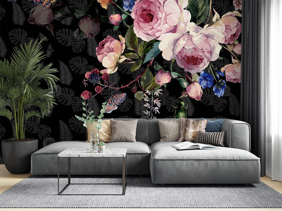 Watercolour Pattern Floral Flowers Black Wallpaper Mural