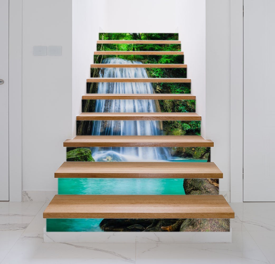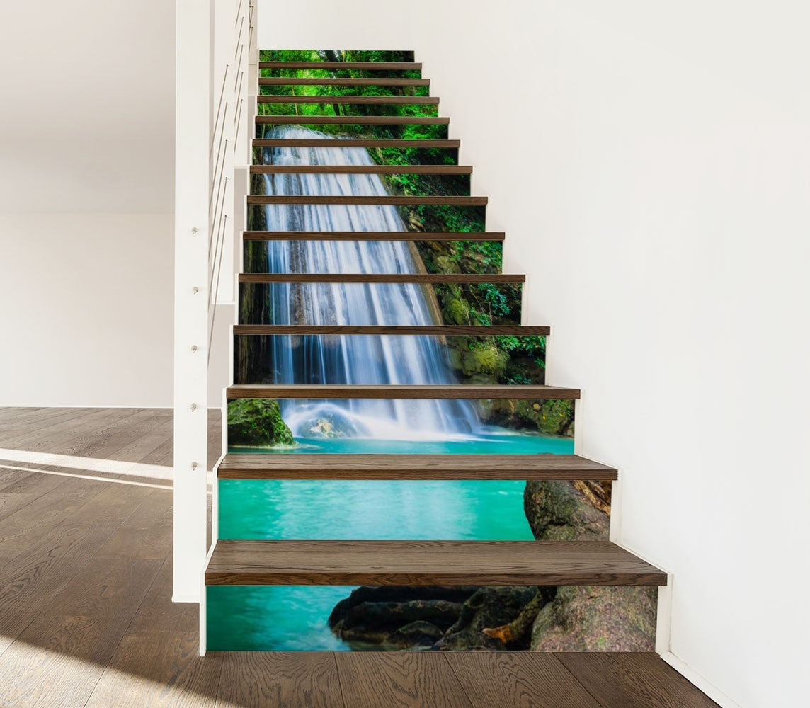 Waterfall Rainforest Nature Black Stair Riser Decals, Waterproof Removable Staircase Decals, Vinyl Peel And Stick Stairs Decal Stickers