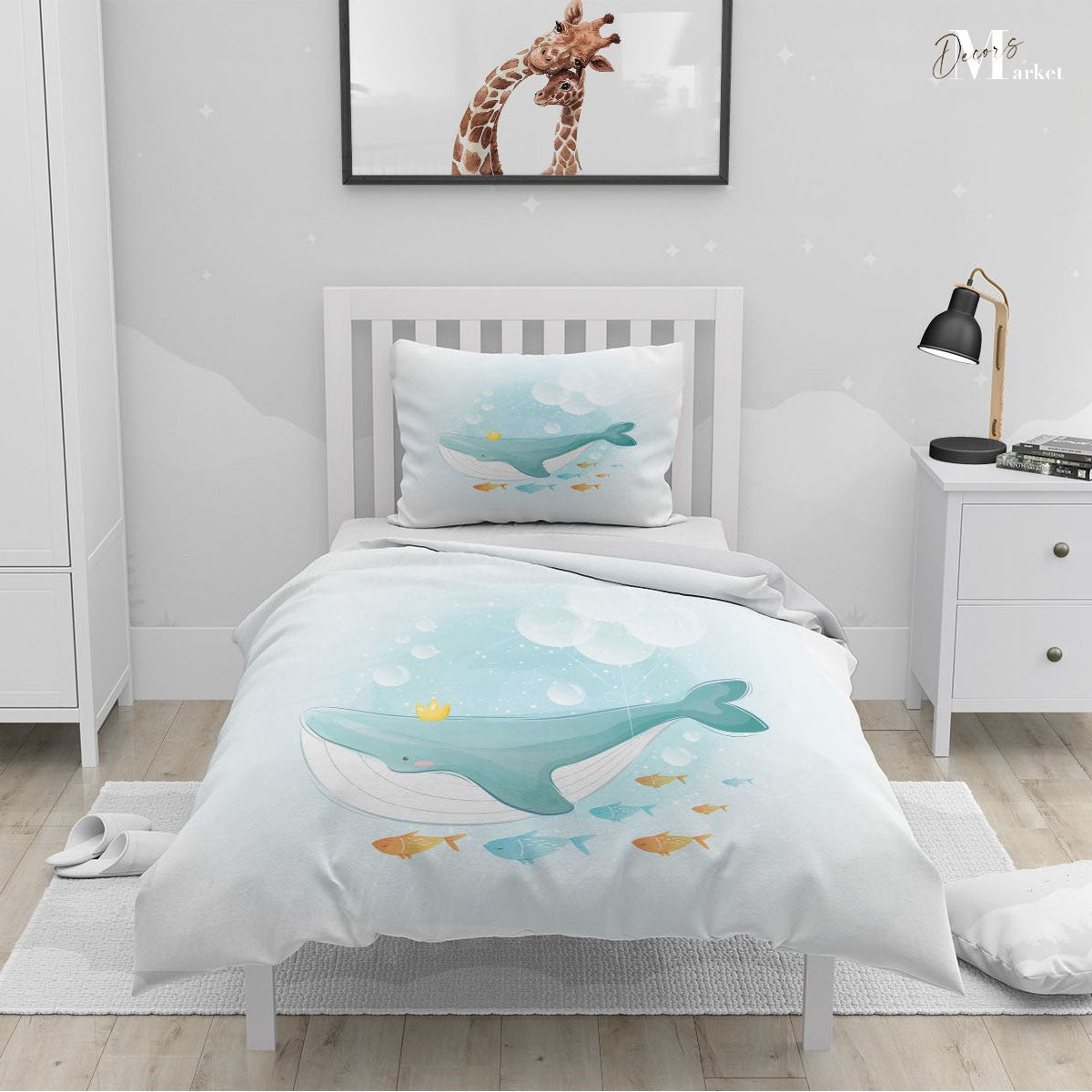 Whale Fly Dream Duvet Cover Set w Pillow Cover, Green Kids Cartoon 3D Quilt Cover, Single Double Queen King Size Doona Cover
