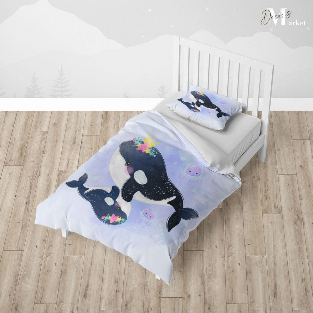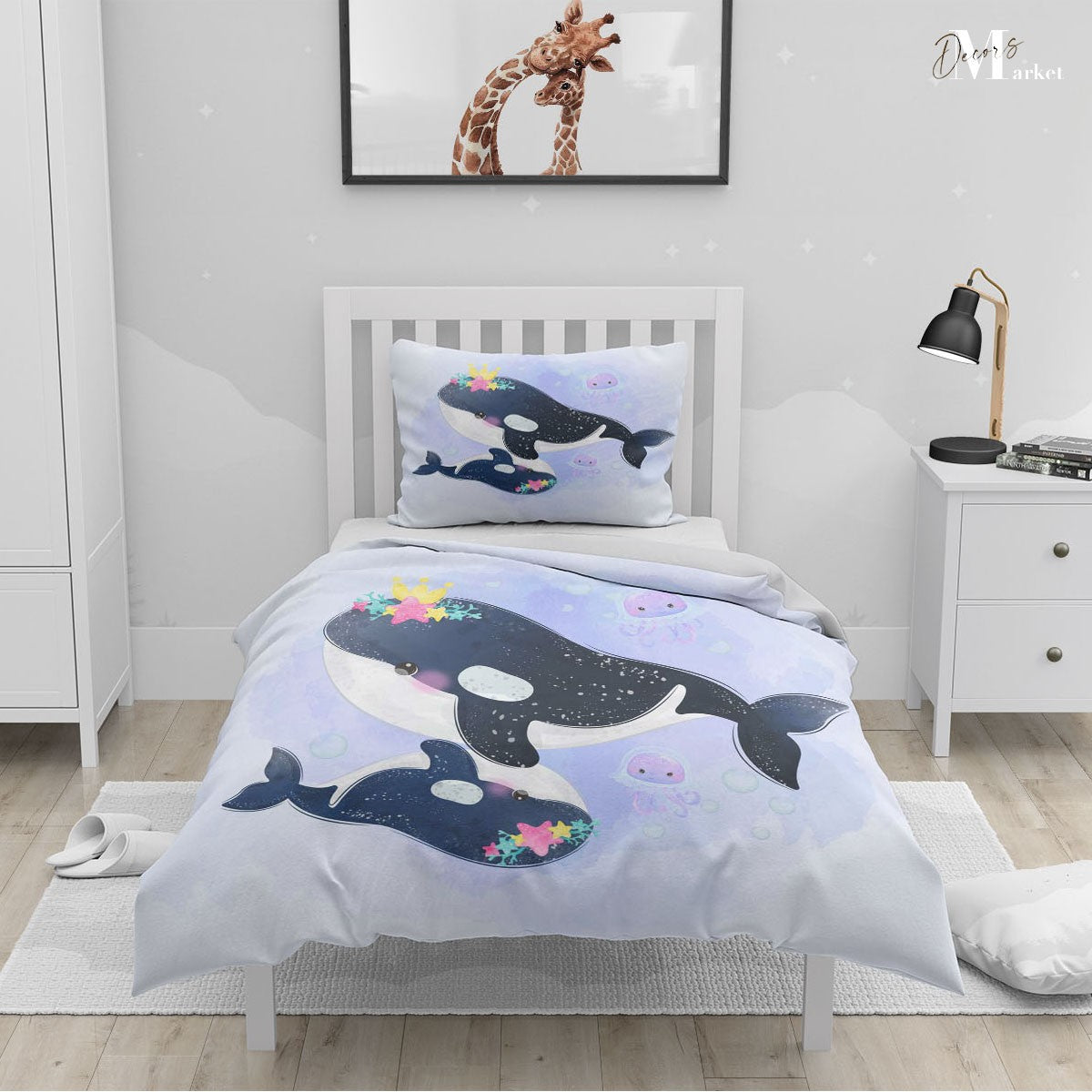 Whale Prince Family Duvet Cover Set w Pillow Cover, Blue Kids Cartoon 3D Quilt Cover, Single Double Queen King Size Doona Cover