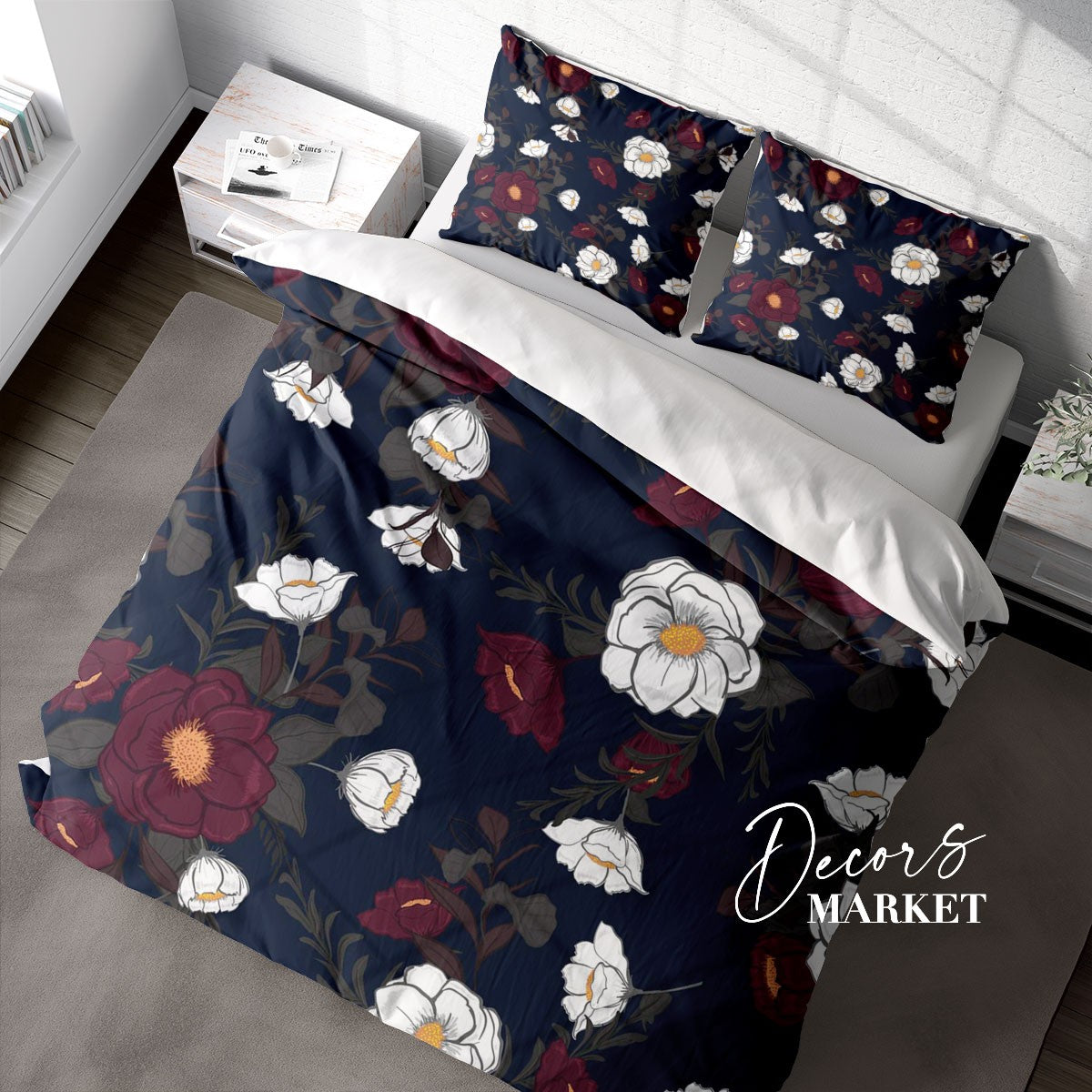 White And Red Roses Duvet Cover Set w Pillowcases, Dark Floral Flowers 3D Quilt Cover, 3pc Single Double Queen King Size Doona Cover