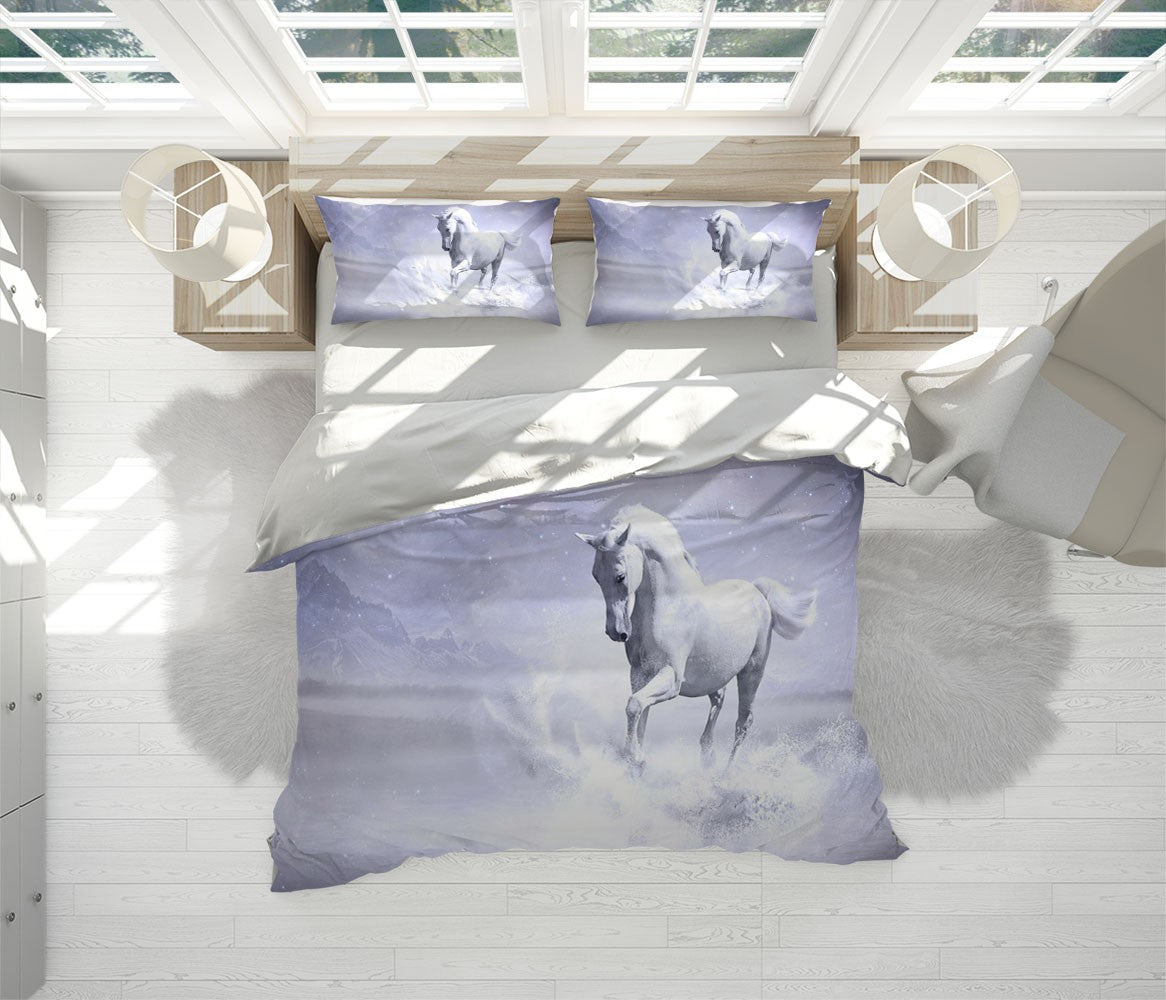 White Horses Animals Gray 3D Duvet Cover Set W Pillow Cover, Single Double Queen King Size, Printed Cotton Quilt Doona Cover 3 Pcs