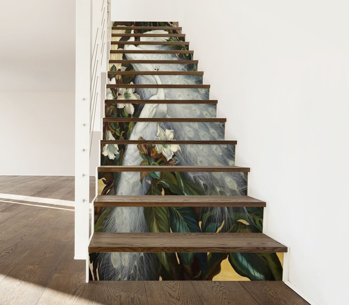 White Peacock Animals White Stair Riser Decals, Waterproof Removable Staircase Decals, Vinyl Peel And Stick Stairs Decal Stickers