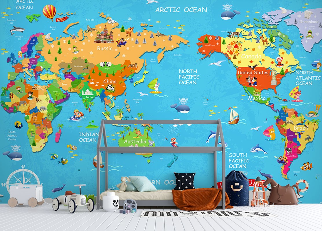 Wildlife Map Kids Kids Map Bright Wallpaper Mural,Self-Adhesive Peel And Stick 3D Wall Mural,Australian Company Bedroom Wall Decor