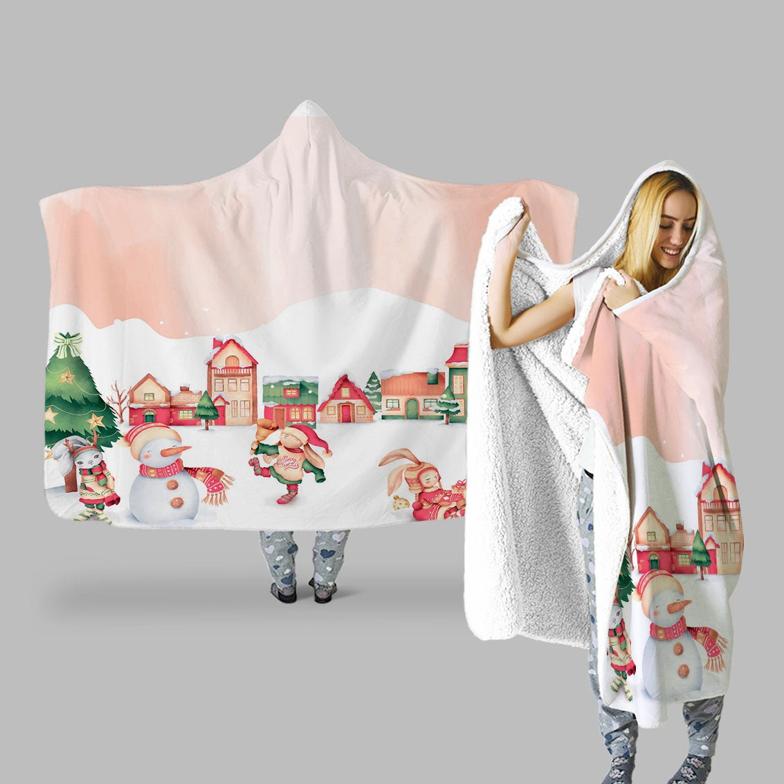 Winter Holiday Bunnies Animals Rabbits & Rodents Creamy Personalized Hooded Throw Blanket Fleece Hoodie Cape