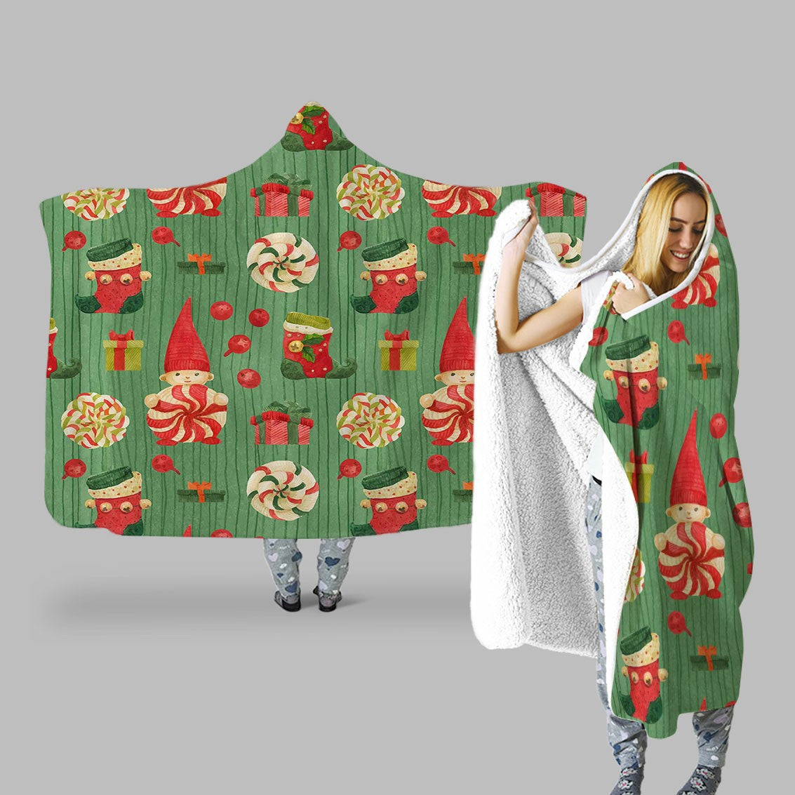 Winter Holiday Candies Texture Patterns Green Personalized Hooded Throw Blanket Fleece Hoodie Cape