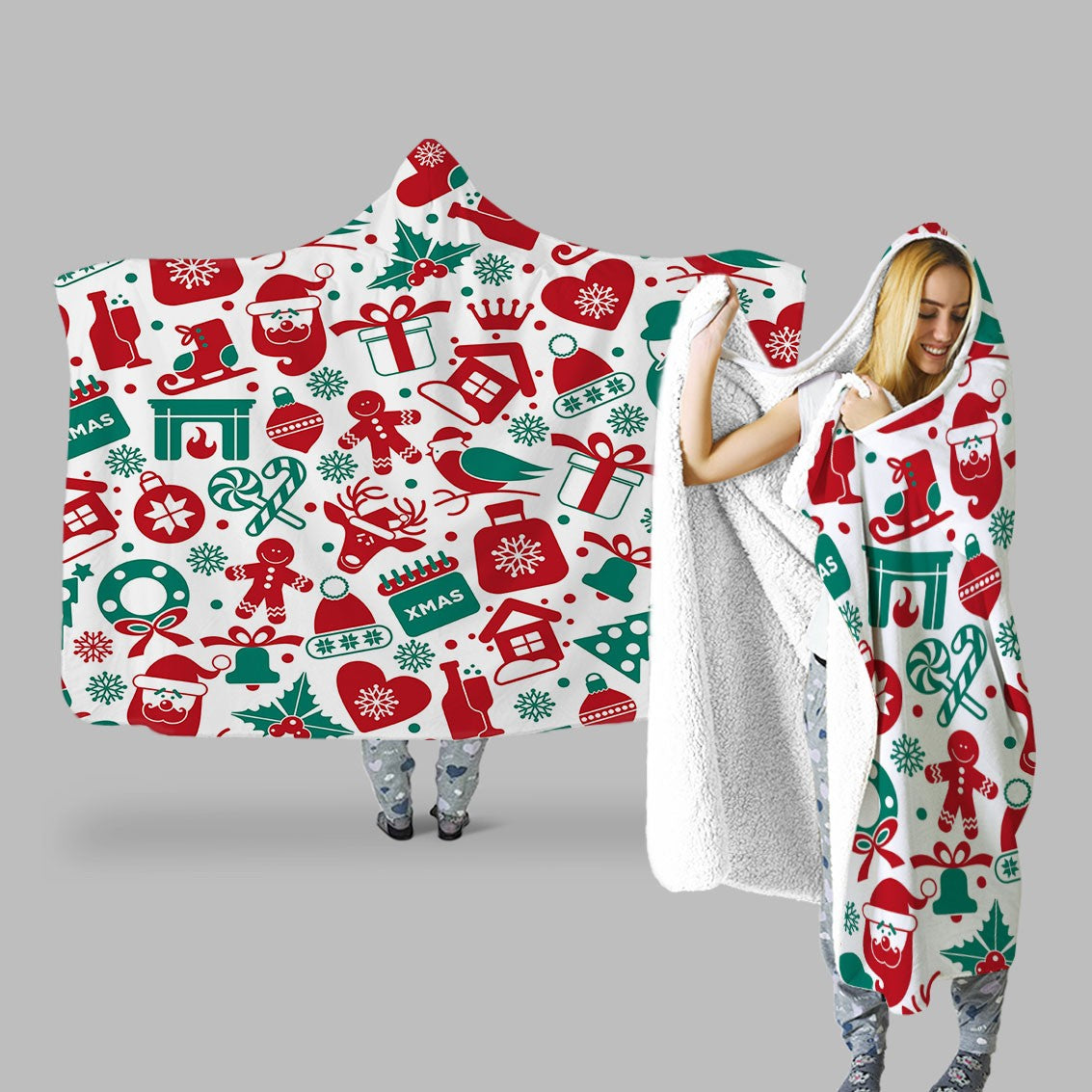 Winter Holiday Icons Texture Patterns Green Personalized Hooded Throw Blanket Fleece Hoodie Cape