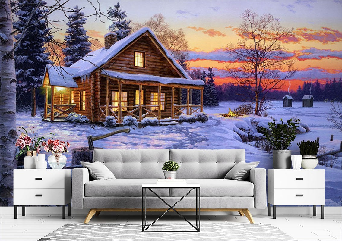 Winter Lodge Art Old Fashioned Purple Wallpaper Mural,Self-Adhesive Peel And Stick 3D Wall Decal,Designer Removable Wall Decor
