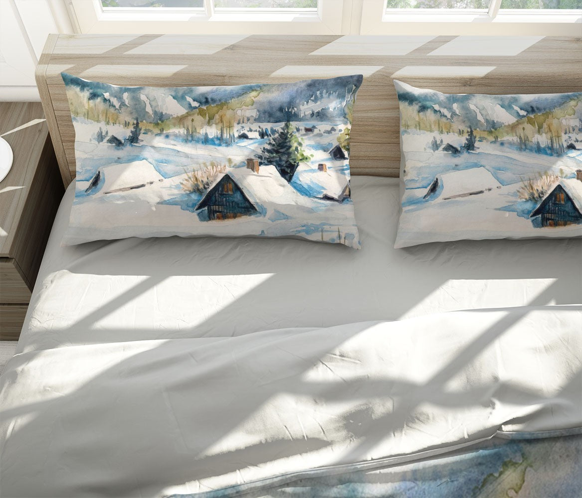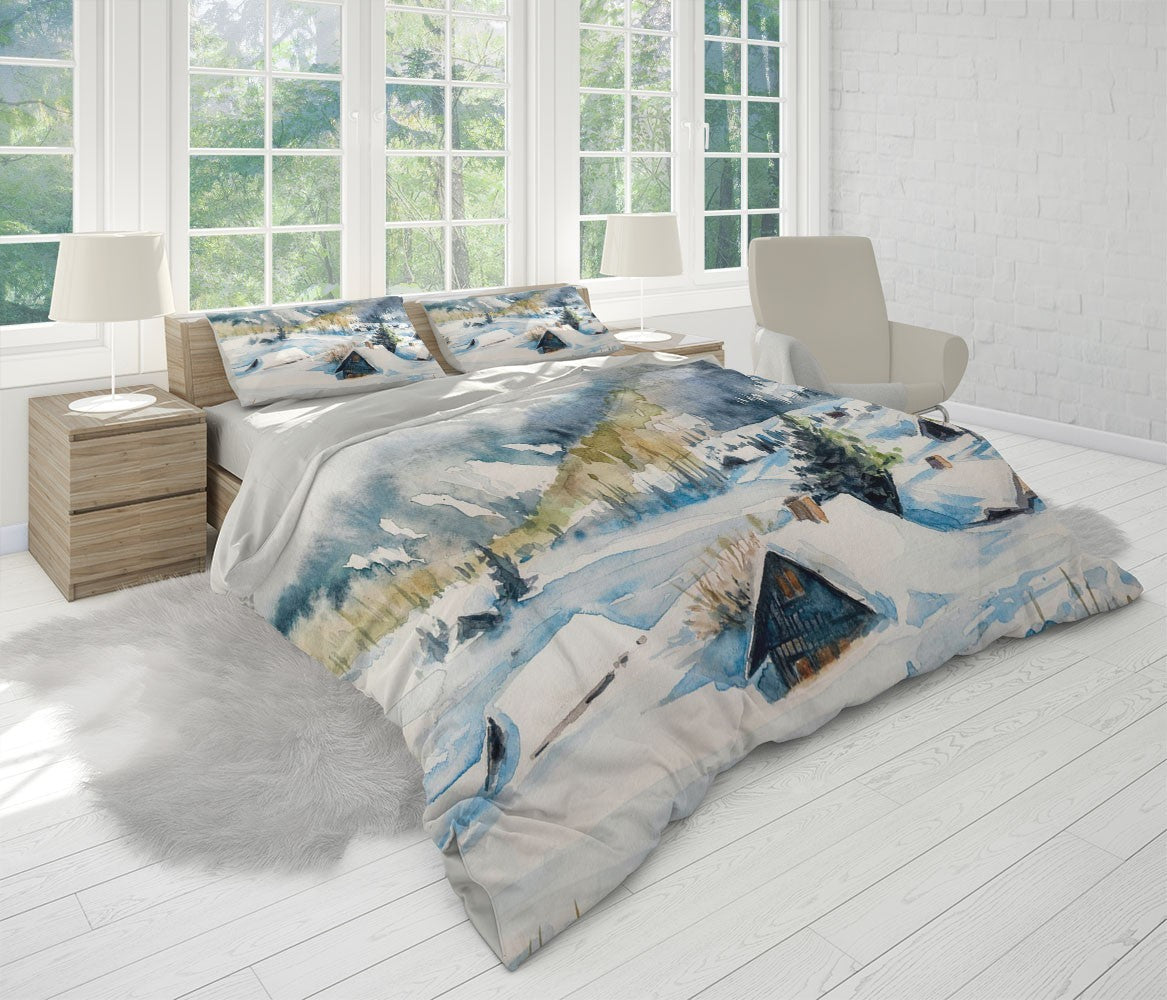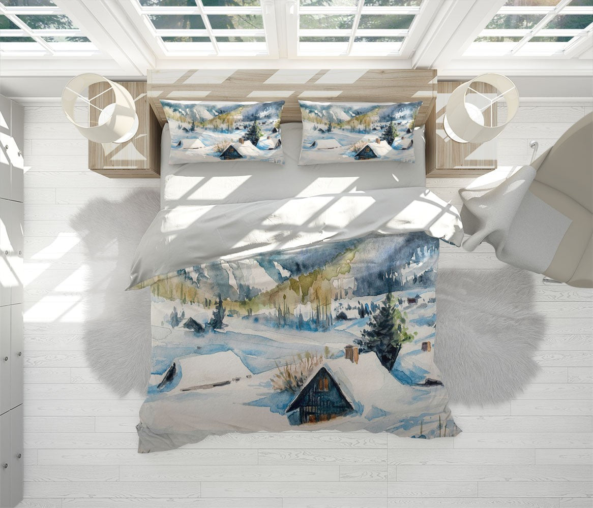 Winter Snow Village Duvet Cover Set W Pillow Cover, White Art Watercolor 3D Quilt Cover, Single Double Queen King Size Doona Cover