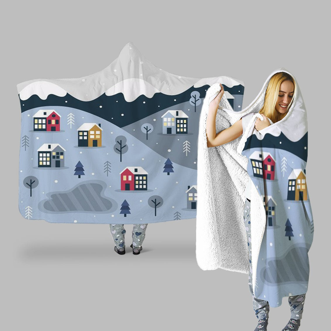 Winter Snowy Houses Texture Patterns Gray Personalized Hooded Throw Blanket Fleece Hoodie Cape