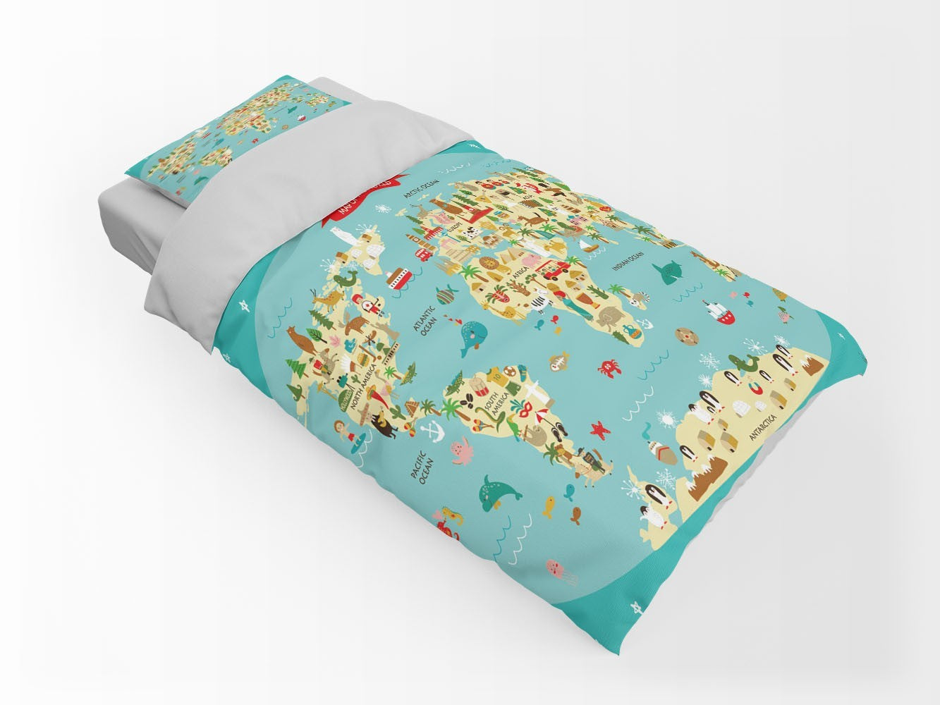 Worldmap Animals Duvet Cover Set W Pillow Cover, Blue Kids Kids Map 3D Quilt Cover, Single Double Queen King Size Doona Cover