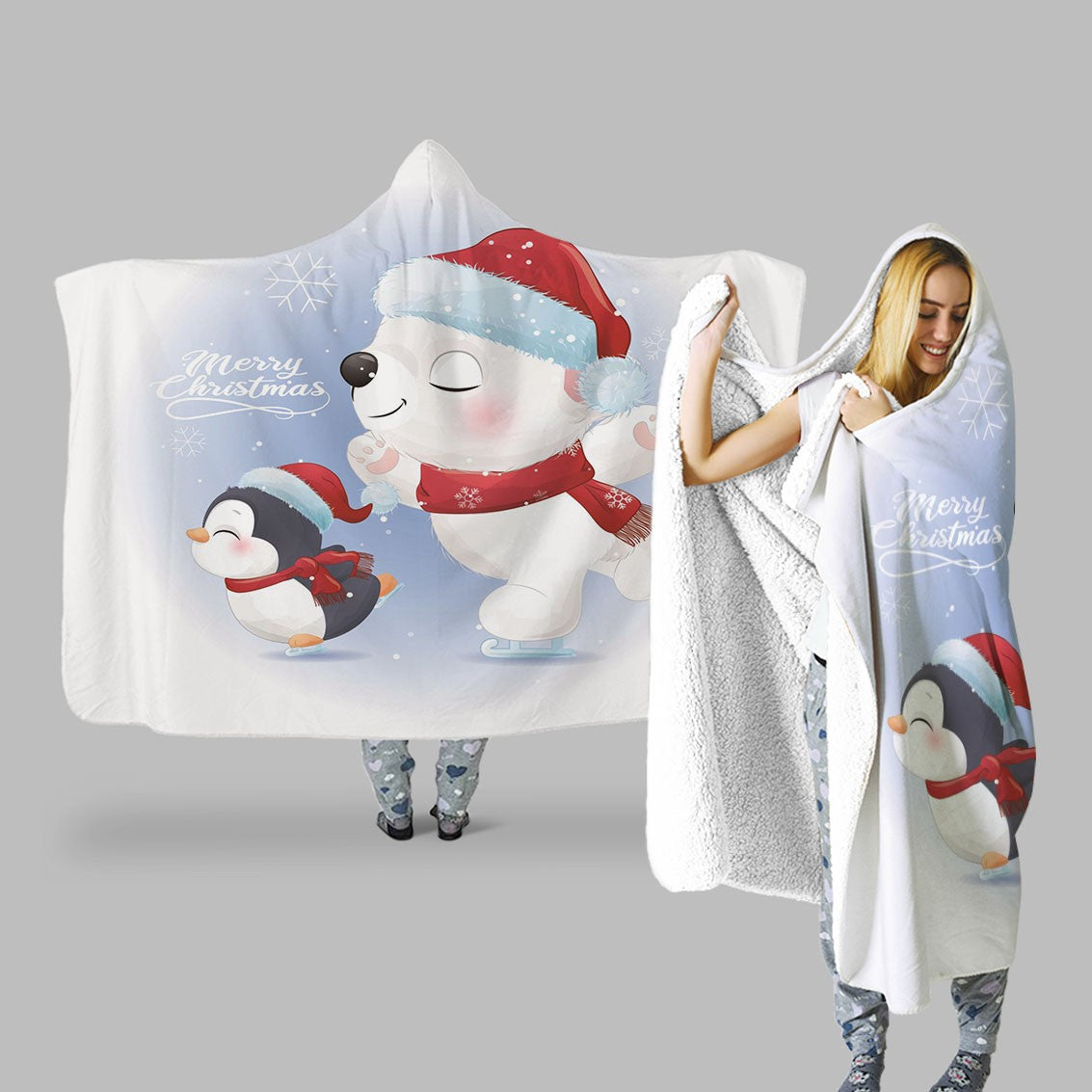 Xmas Penguin Bear Kids Animal Blue Personalized Hooded Throw Blanket Fleece Hoodie Cape