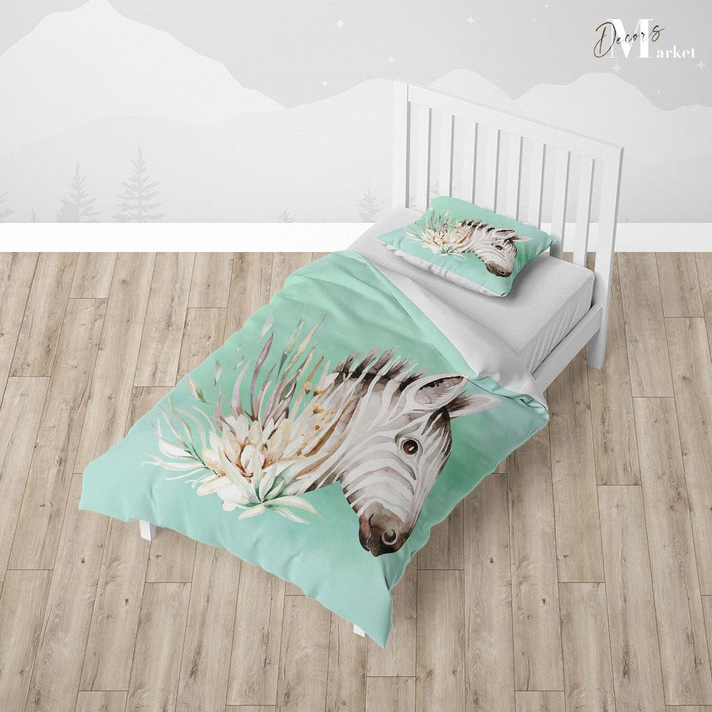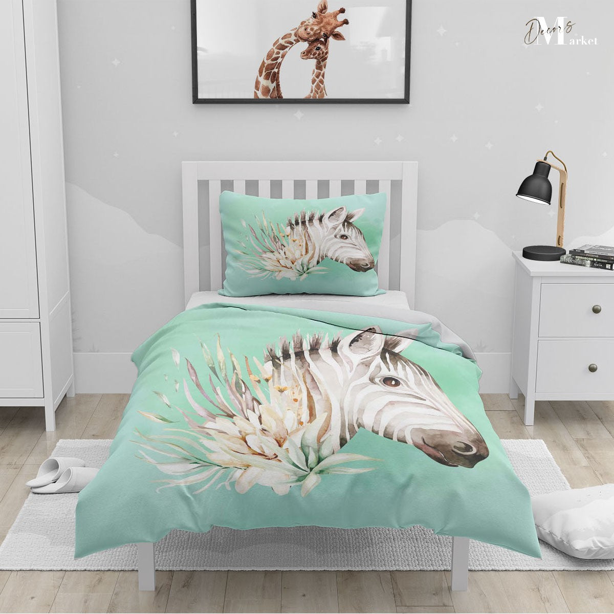 Zebra Flower Duvet Cover Set w Pillow Cover, Green Art Watercolor 3D Quilt Cover, Single Double Queen King Size Doona Cover