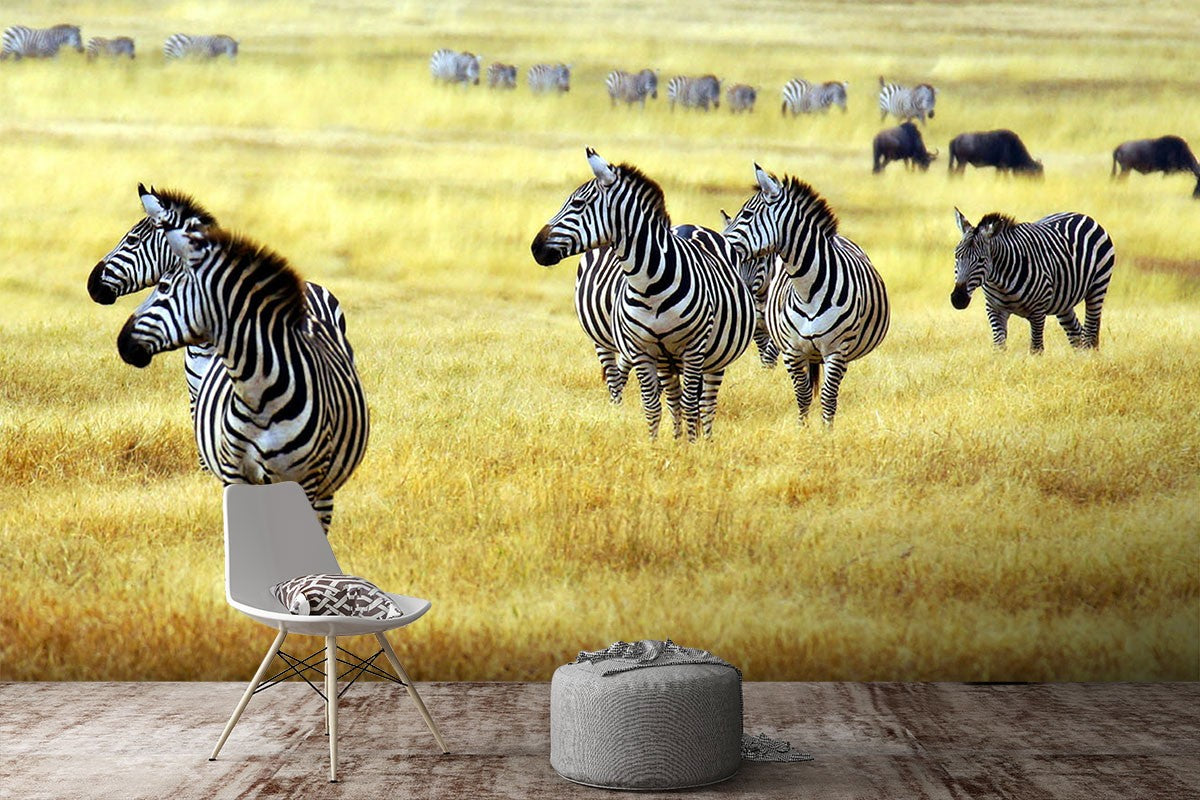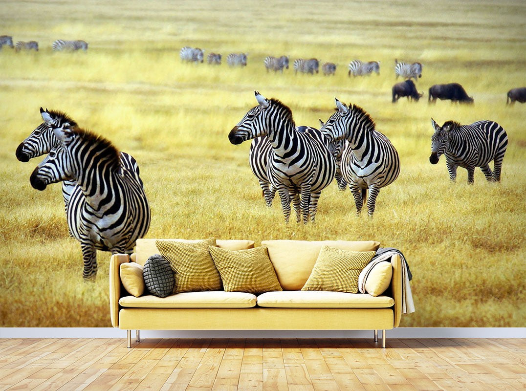 Zebra Steppe Animals Wild Animals Gold Wallpaper Mural,Self-Adhesive Peel And Stick 3D Wall Decor,Removable Bedroom Wall Decor